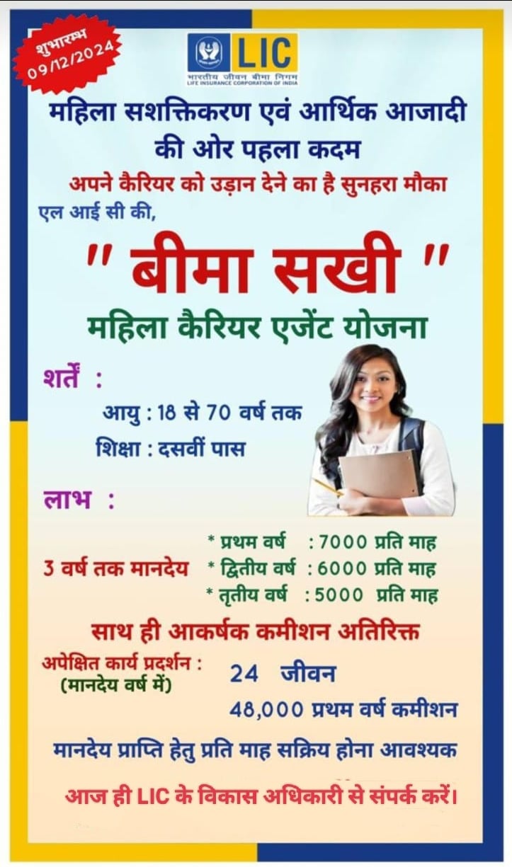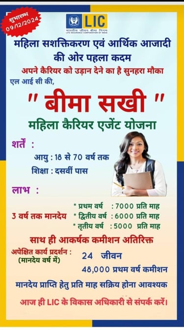 भारतीय जीवन बीमा निगम (LIC) आपके लिए लेकर आया है "बीमा सखी" महिला करियर एजेंट योजना।